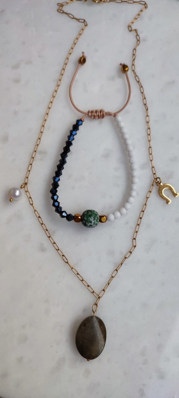 Βραχιόλι με κρυσταλλάκια και ημιπολύτιμες χάντρες αιματίτη και νεφρίτη. Το μέγεθος αυξομειώνεται.